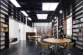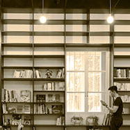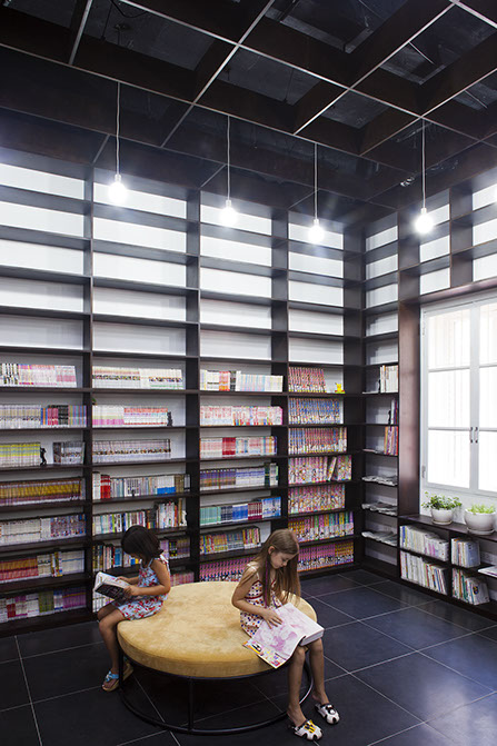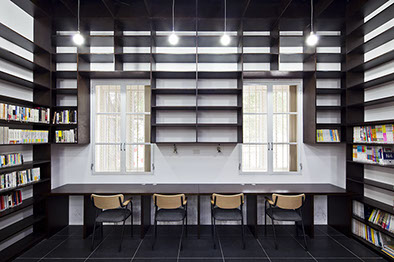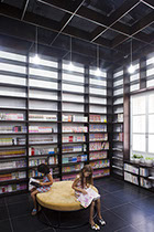 壁面全面を本棚として、更に天井の意匠も壁面と合わせることで、本棚に包まれるような内部空間を計画した。本棚の蔵書はこれから5年を掛け2倍に増やし、その後も様々な入れ替えをしていく予定で、これによって内部ファサードが刻々と変化をし、利用者を楽しませてくれることを期待している。